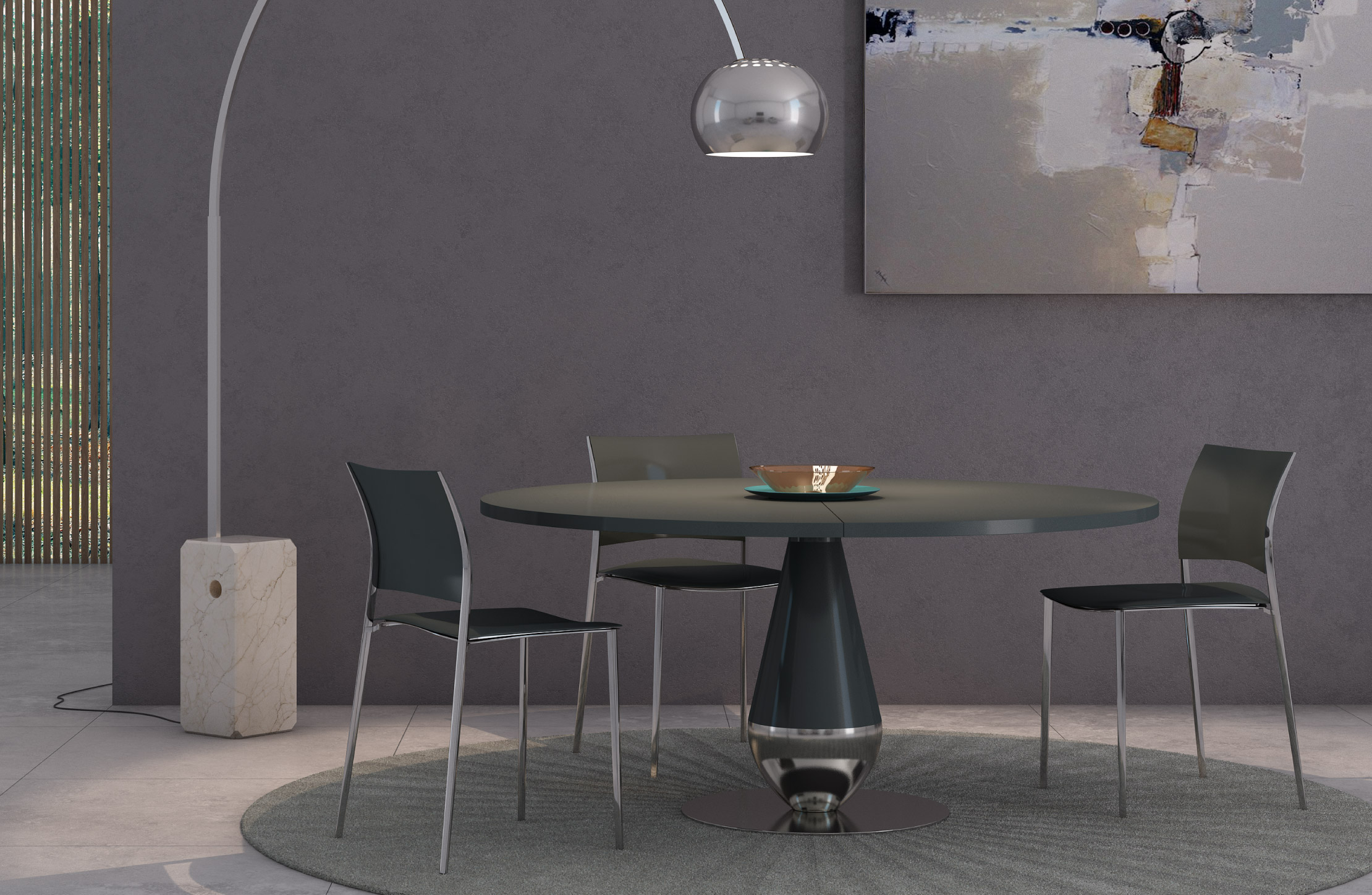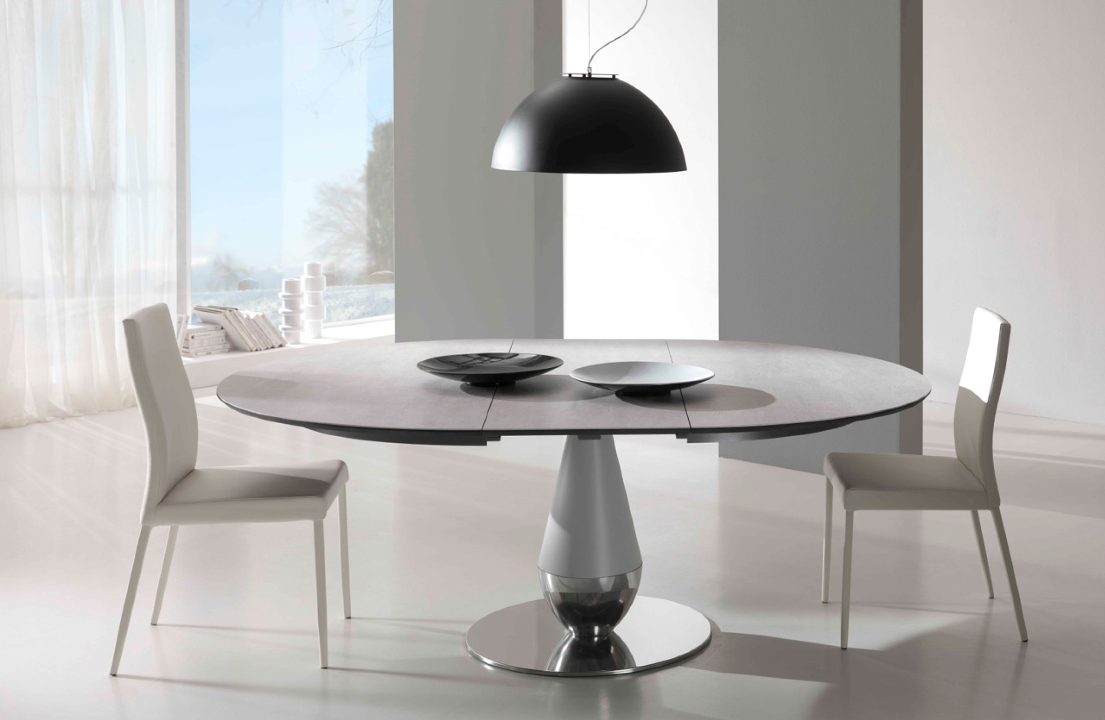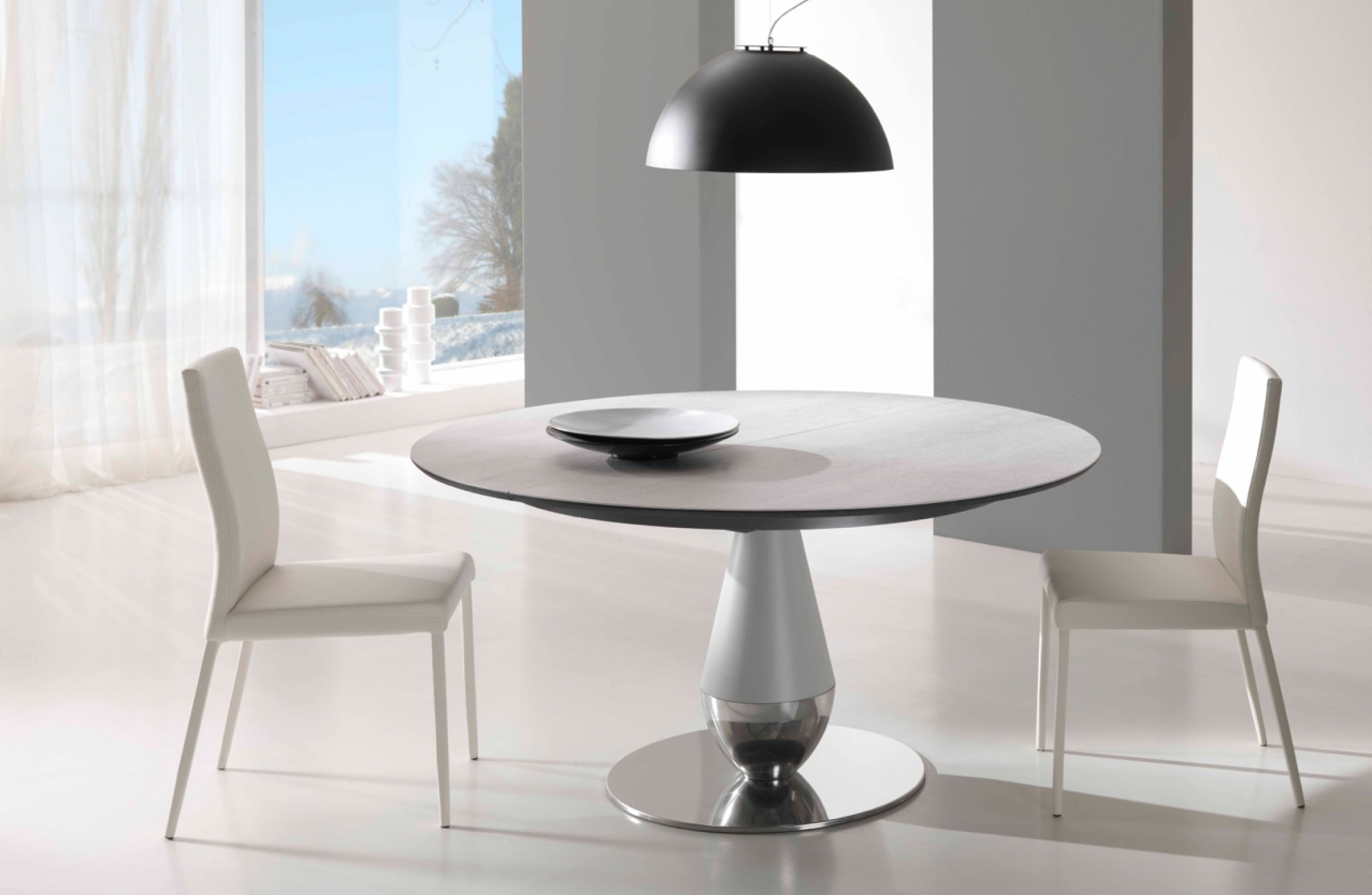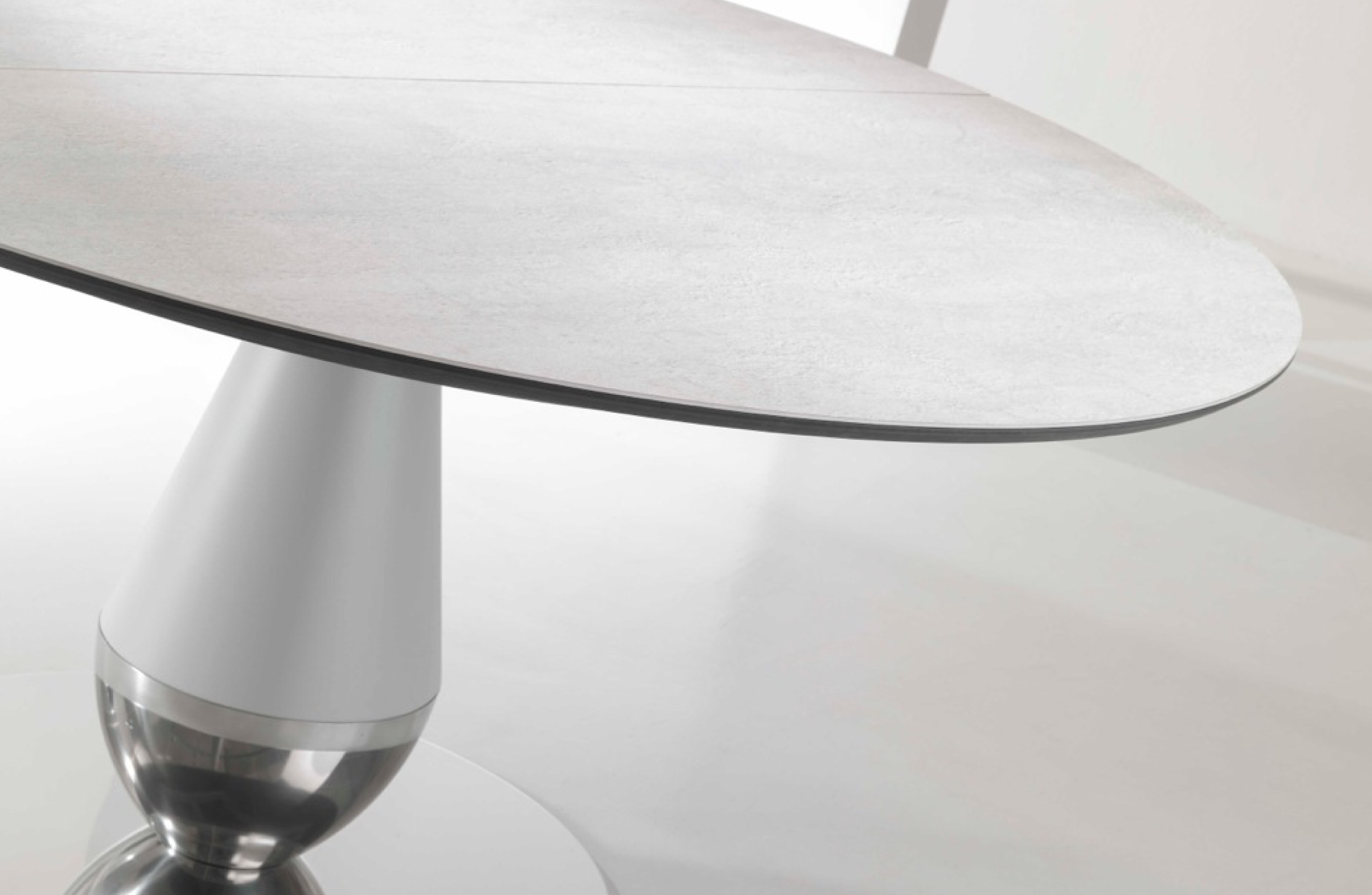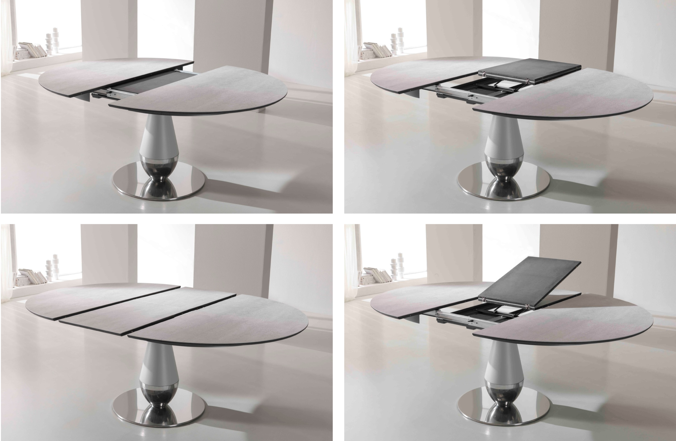 Tables fixes ou extensibles avec base centrale. Colonne centrale en métal revêtu de polyuréthane rigide verni, base en métal massif revêtu de tôle d’aluminium vernie ou pour la version rond en acier inox poli, plateaux en céramique ép. 3mm ou en cristal, brillant ou mat, ép. 4mm, avec support en MDF.