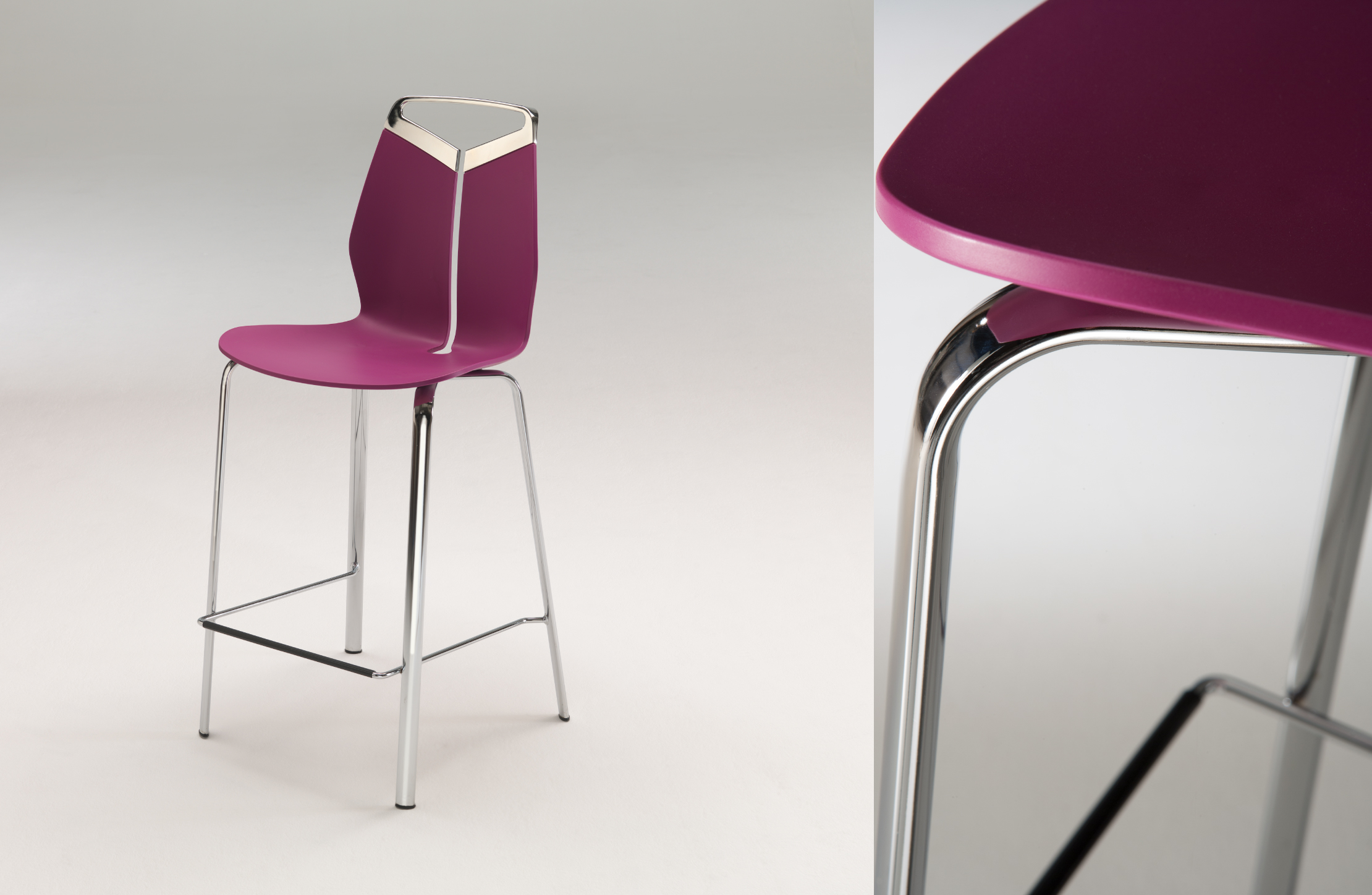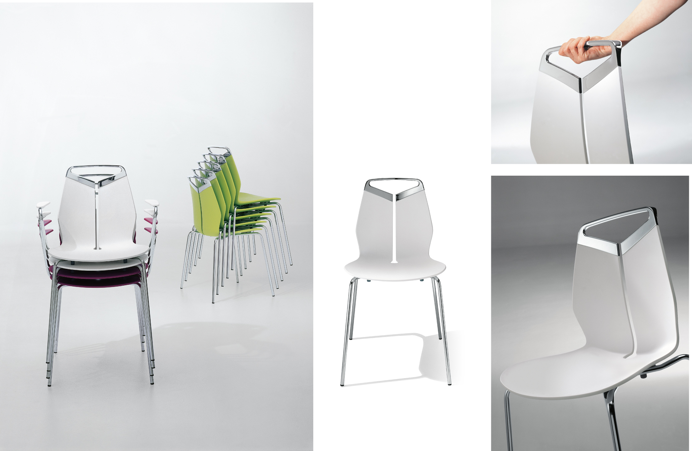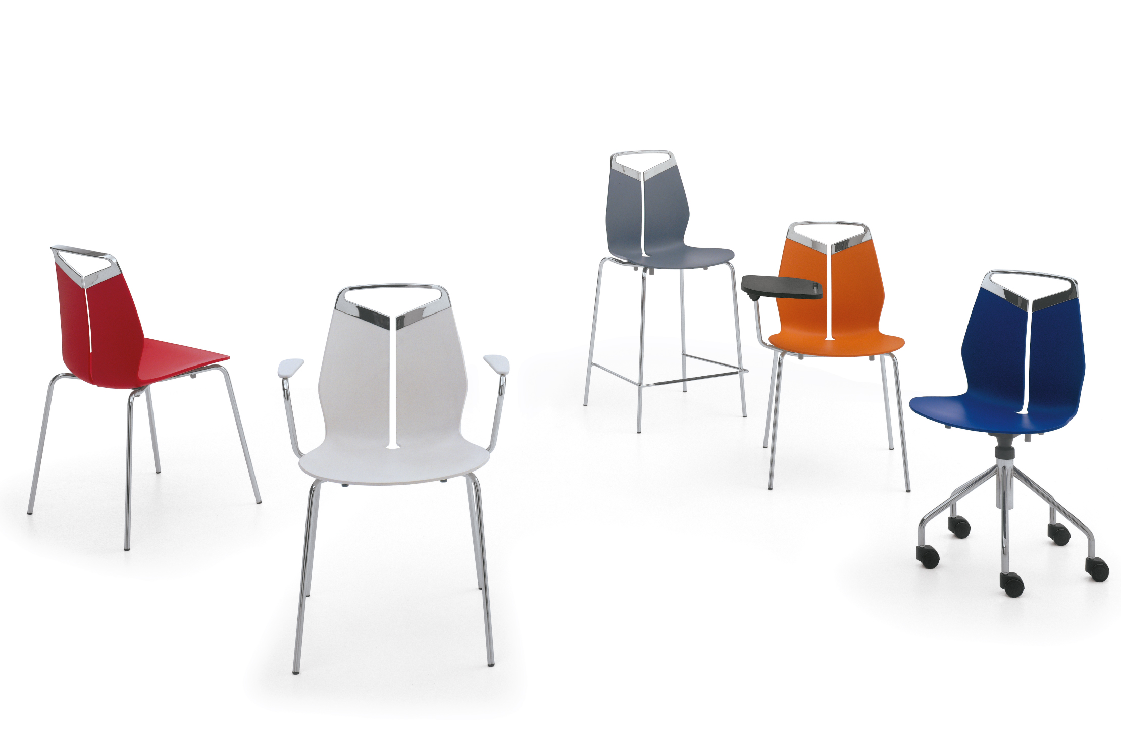 Collezione di sedie, poltroncine e sgabelli di diverse dimensioni. Maniglia in fusione di metallo. Seduta in polipropilene colorato in pasta, resistente ai raggi UV. Struttura in acciaio cromato o verniciato, con trattamento seciale galvanico, per uso esteno. Disponibile anche nella versione per uso esterno.