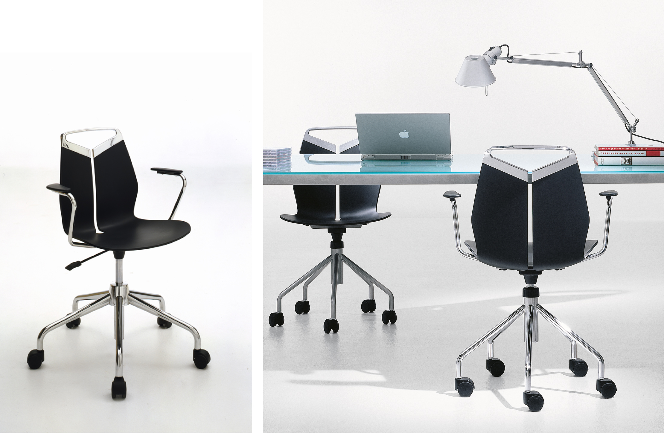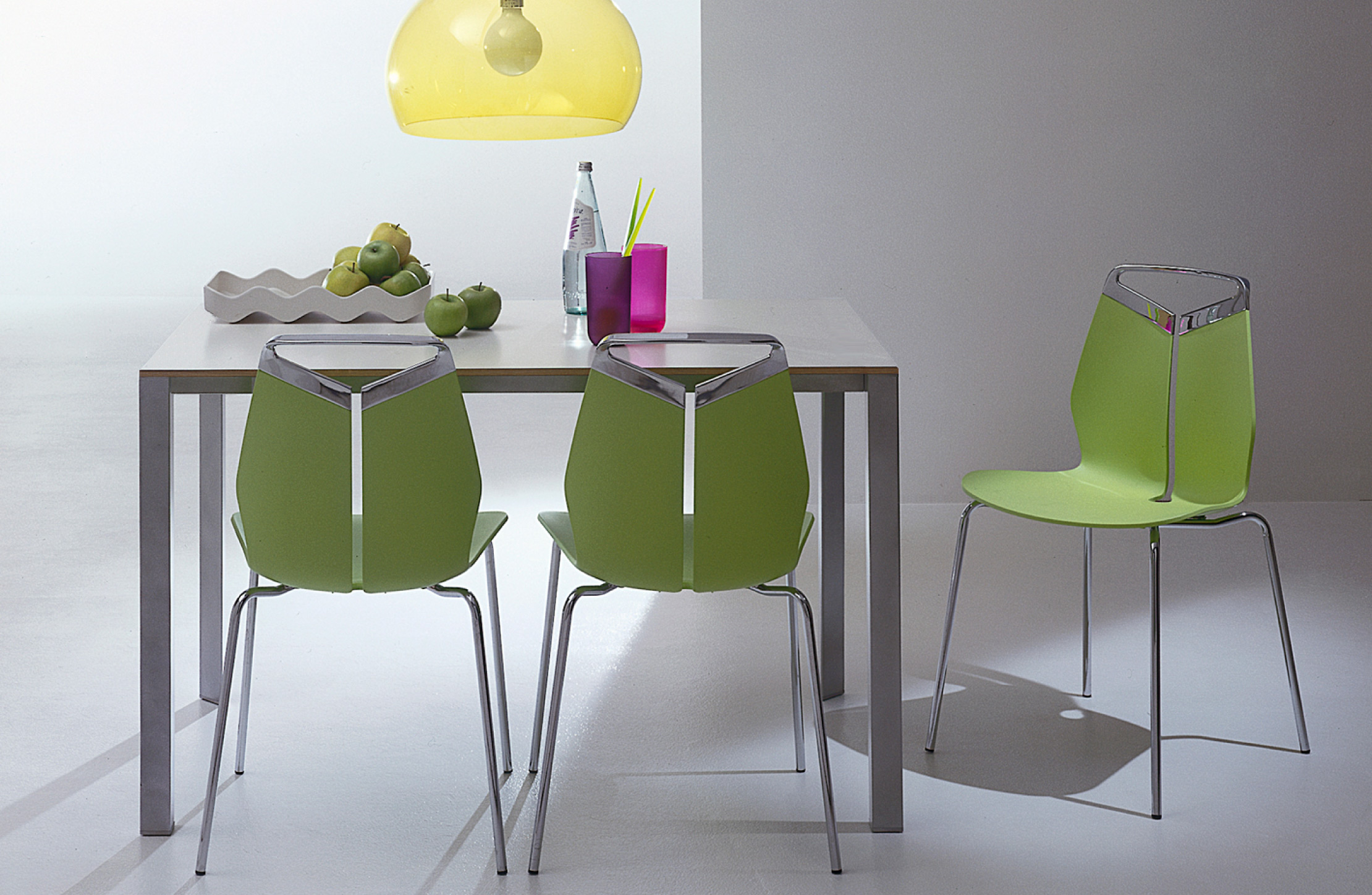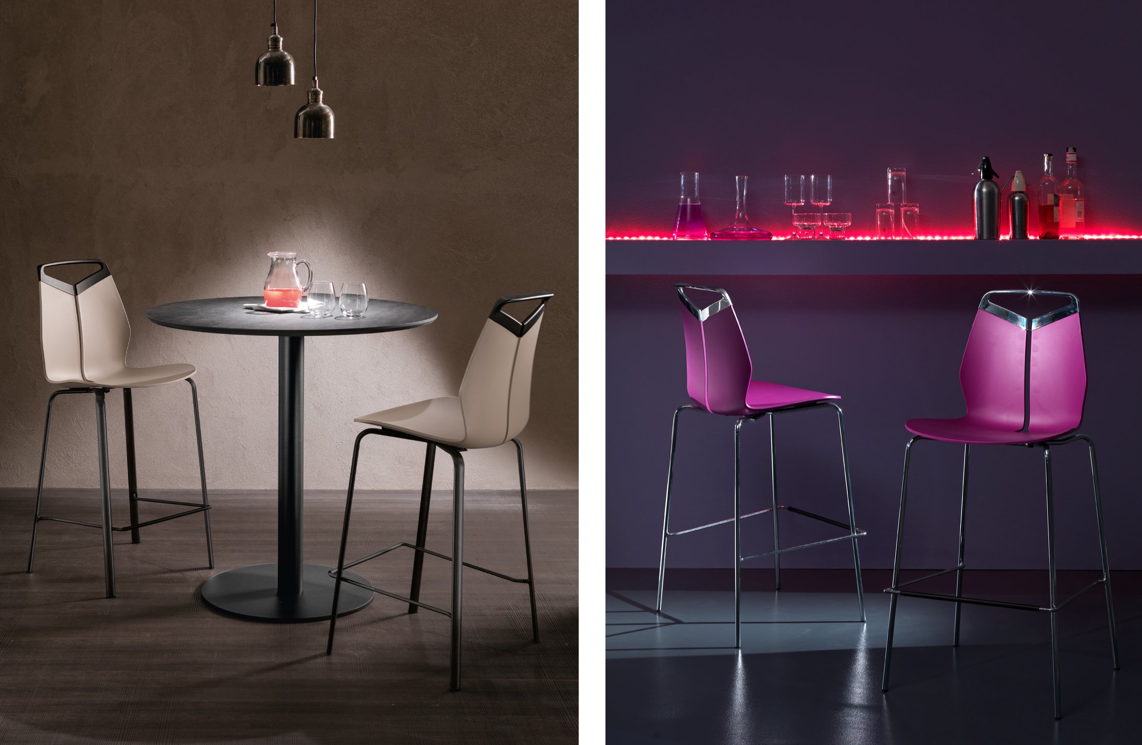 Collezione di sedie, poltroncine e sgabelli di diverse dimensioni. Maniglia in fusione di metallo. Seduta in polipropilene colorato in pasta, resistente ai raggi UV. Struttura in acciaio cromato o verniciato, con trattamento seciale galvanico, per uso esteno. Disponibile anche nella versione per uso esterno.