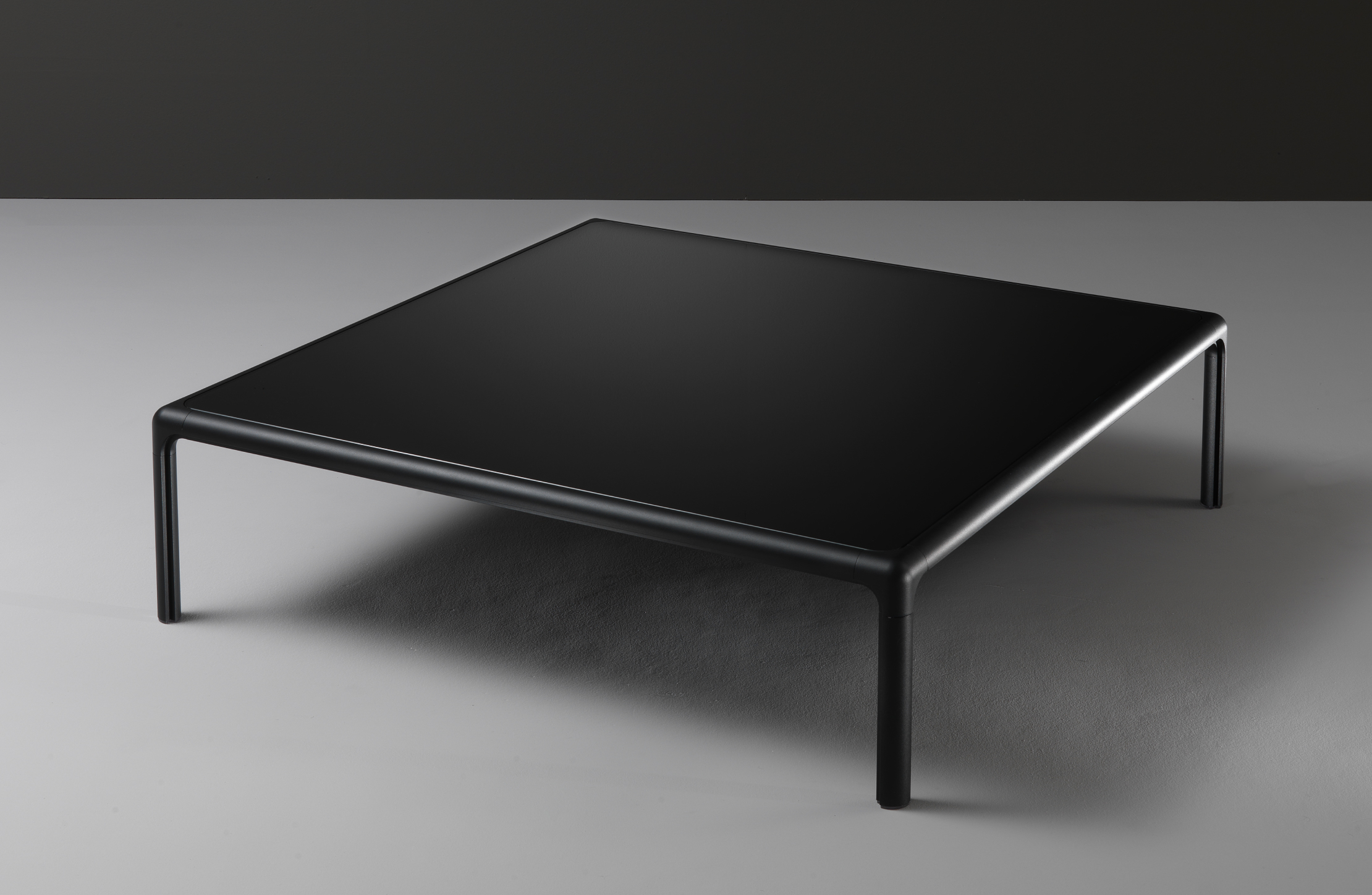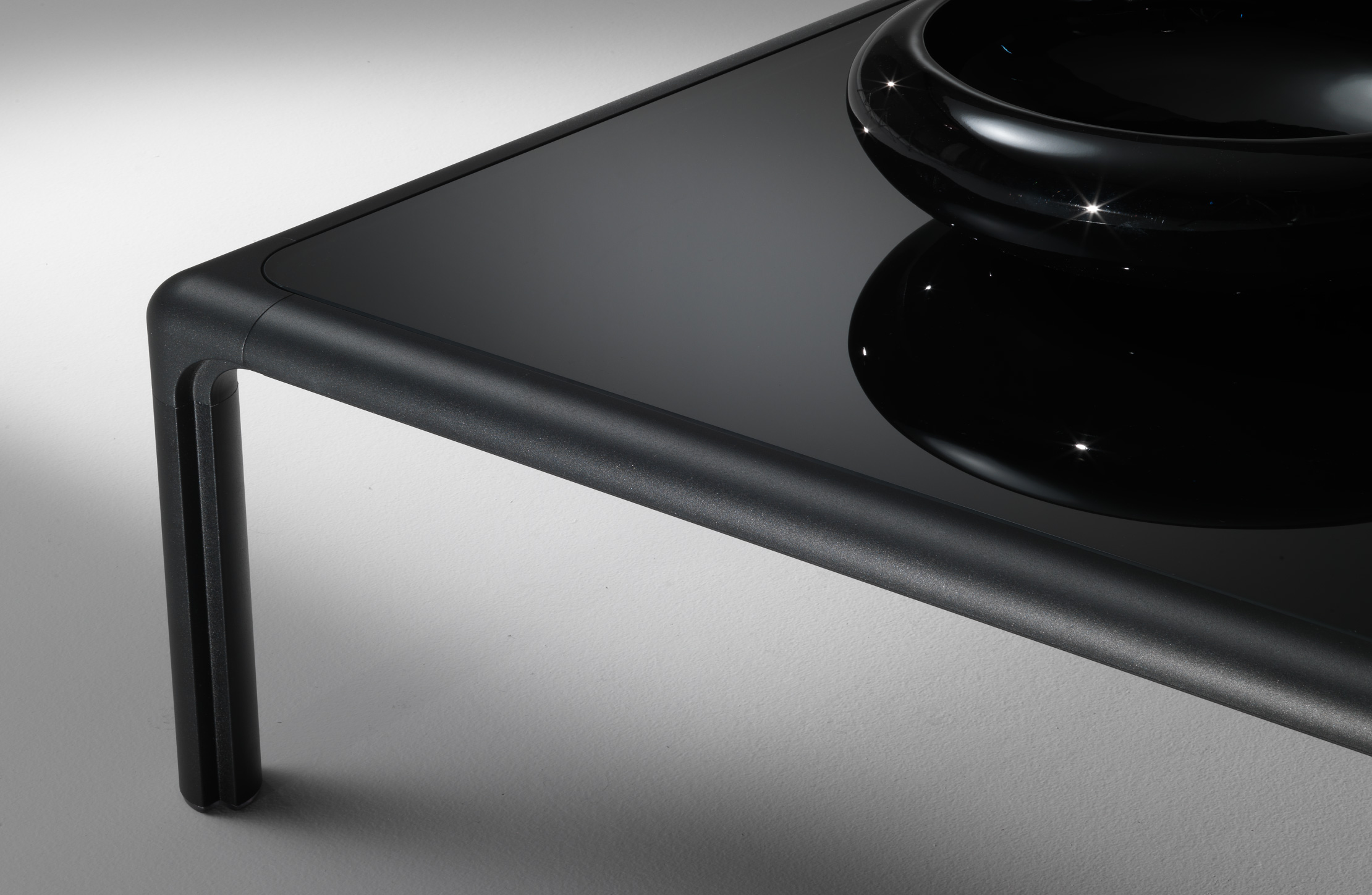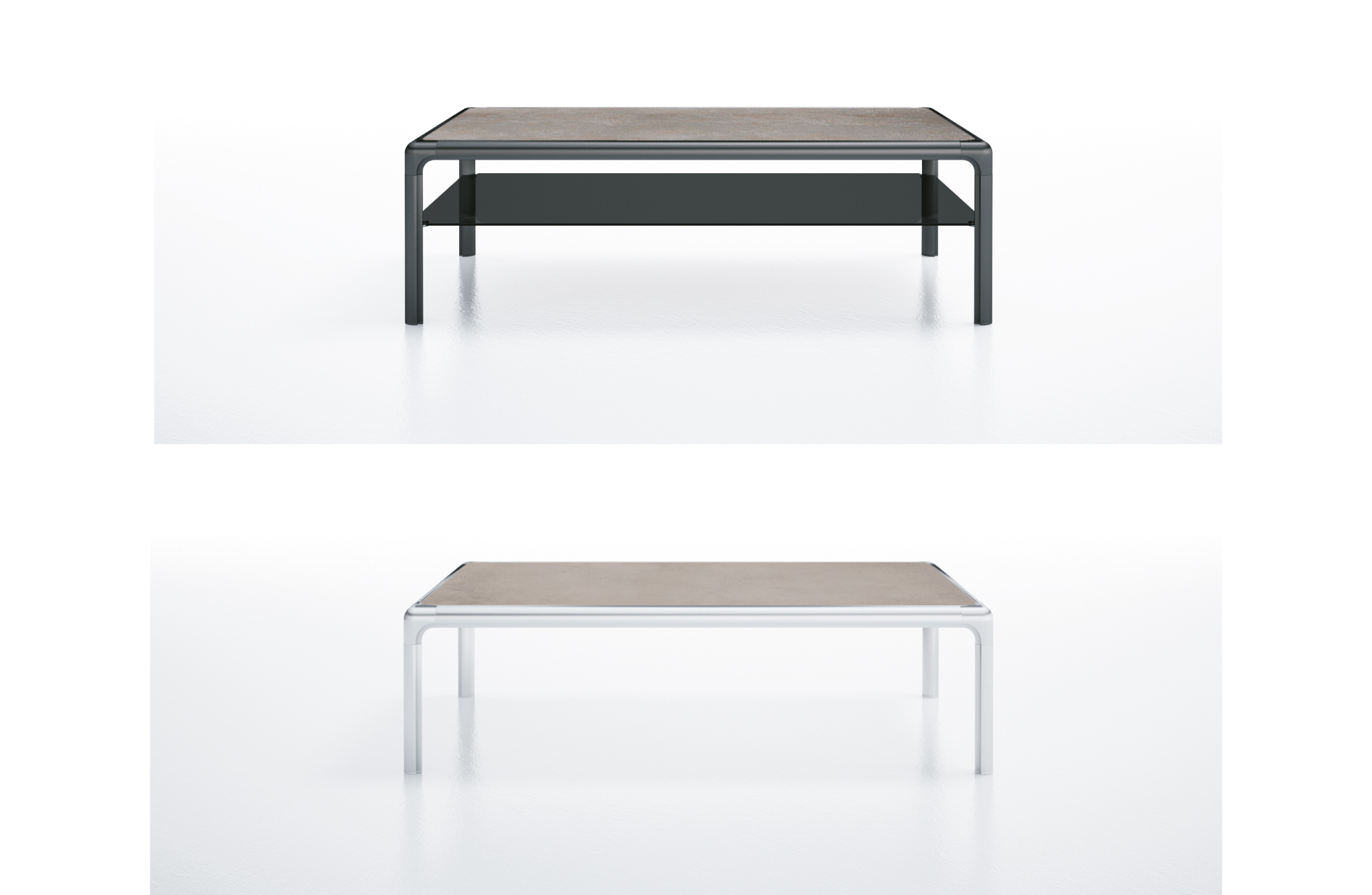 Serie di tavolini, consolle con struttura e gambe in alluminio estruso e giunti in alluminio pressofuso. Finitura brillante o verniciata con polveri epossidiche. Piani in cristallo verniciato o ceramica stratificata con vetro. Disponibile anche nella versione per uso esterno.