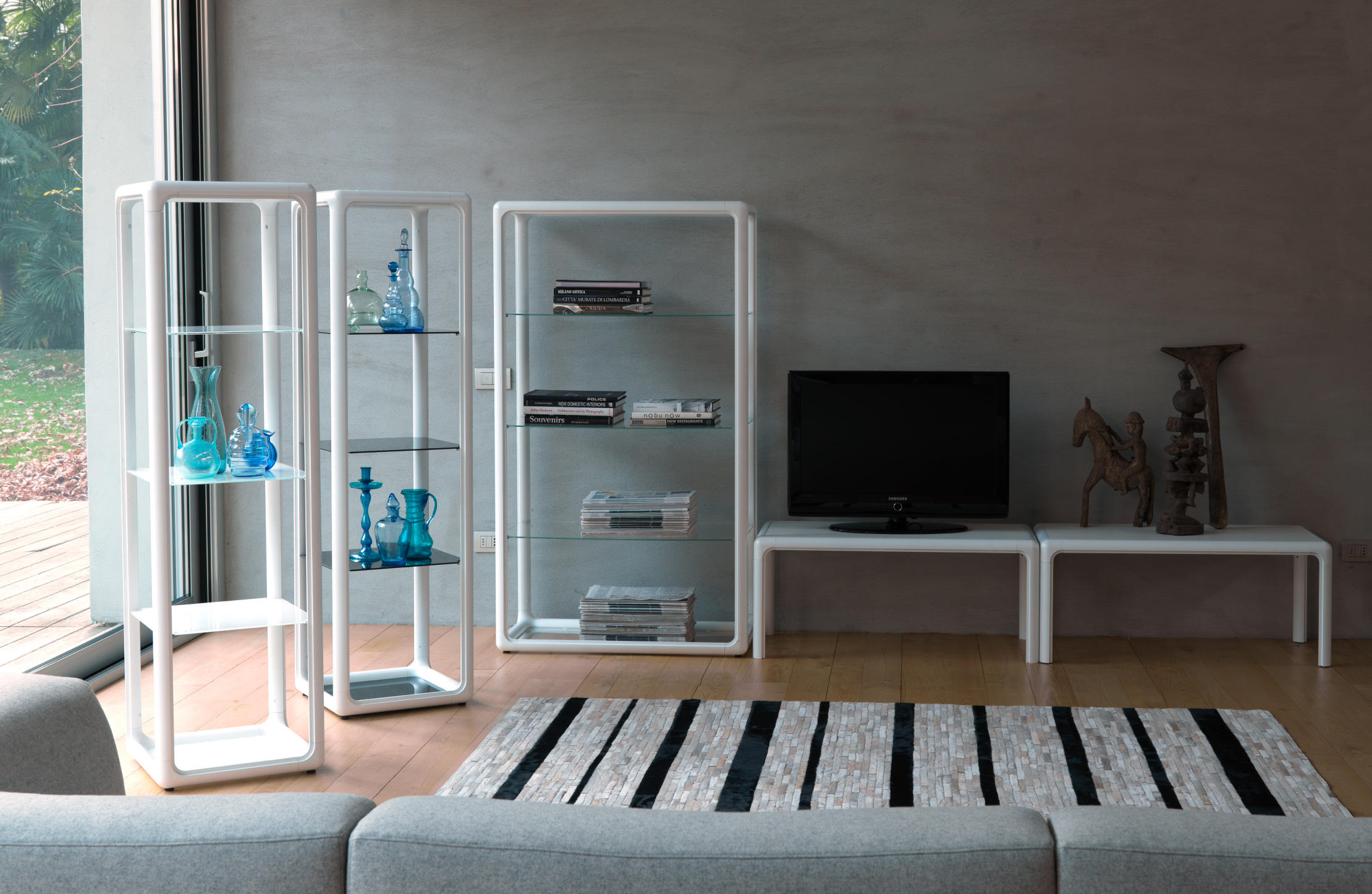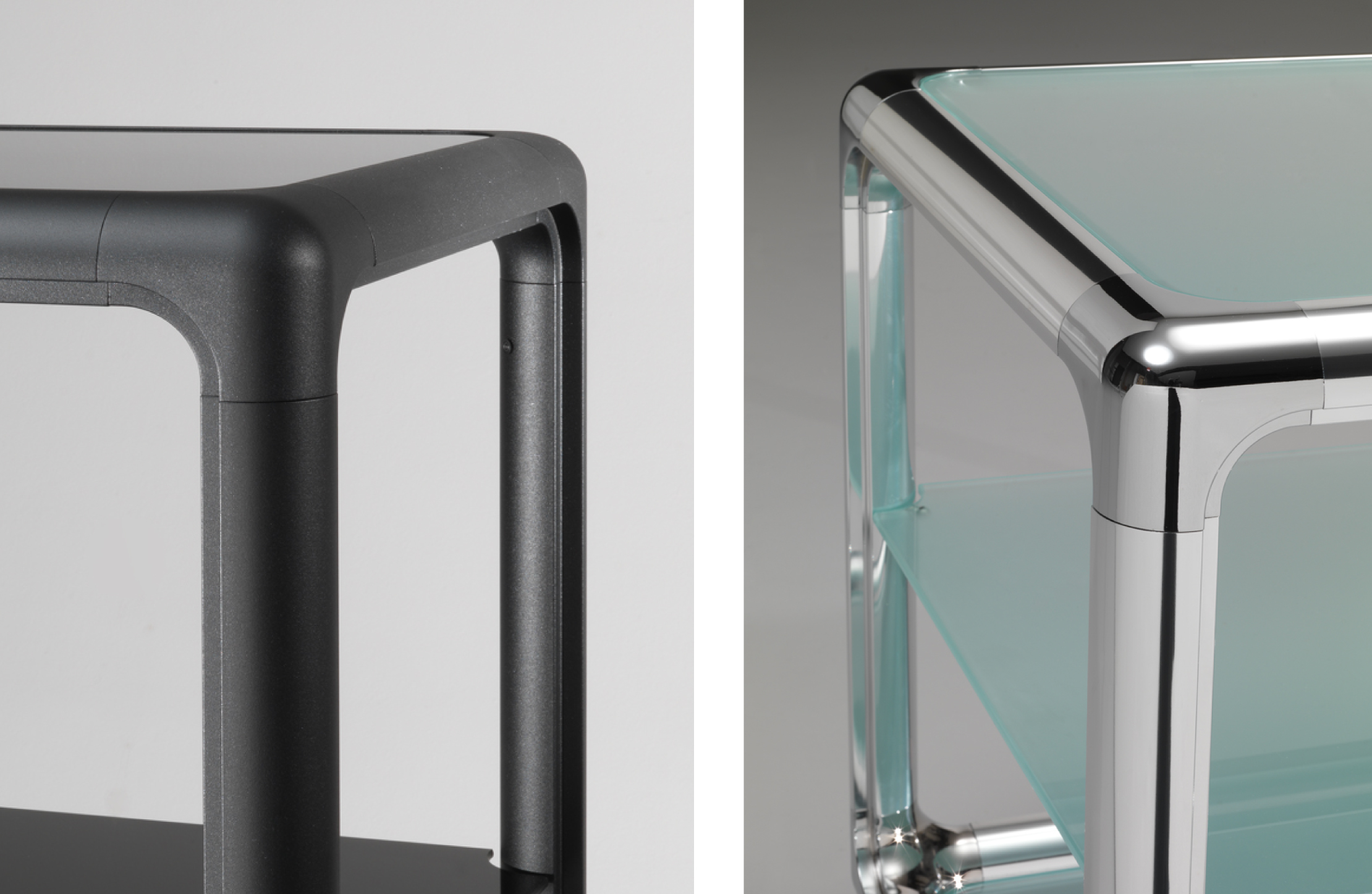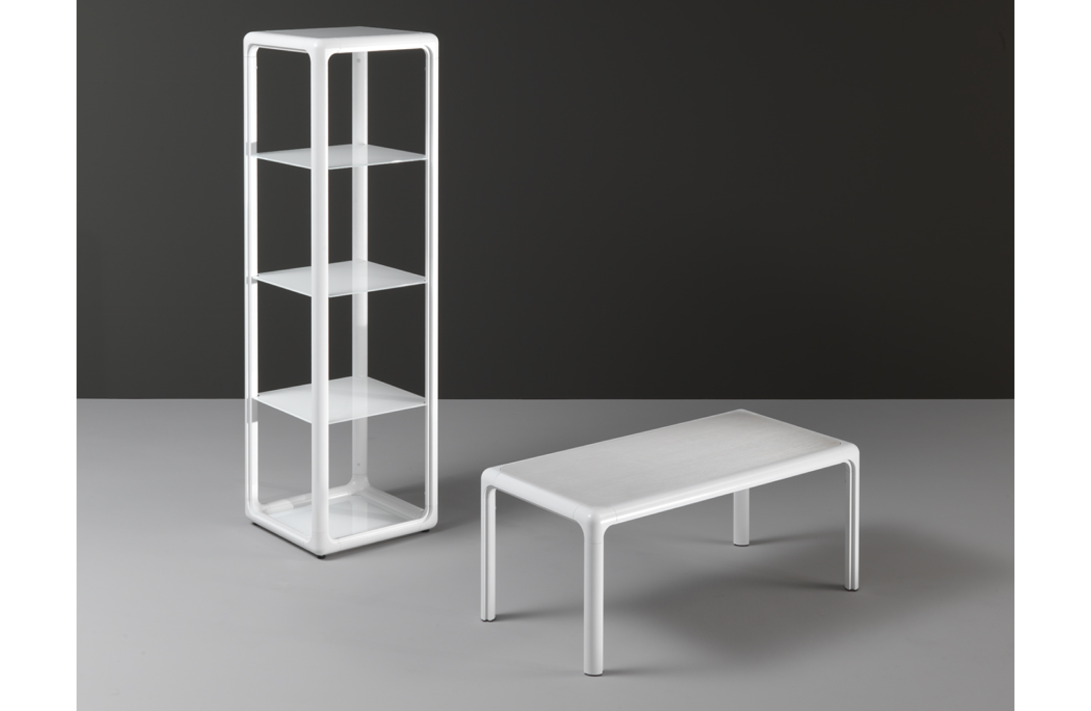 Serie di tavolini, consolle con struttura e gambe in alluminio estruso e giunti in alluminio pressofuso. Finitura brillante o verniciata con polveri epossidiche. Piani in cristallo verniciato o ceramica stratificata con vetro. Disponibile anche nella versione per uso esterno.