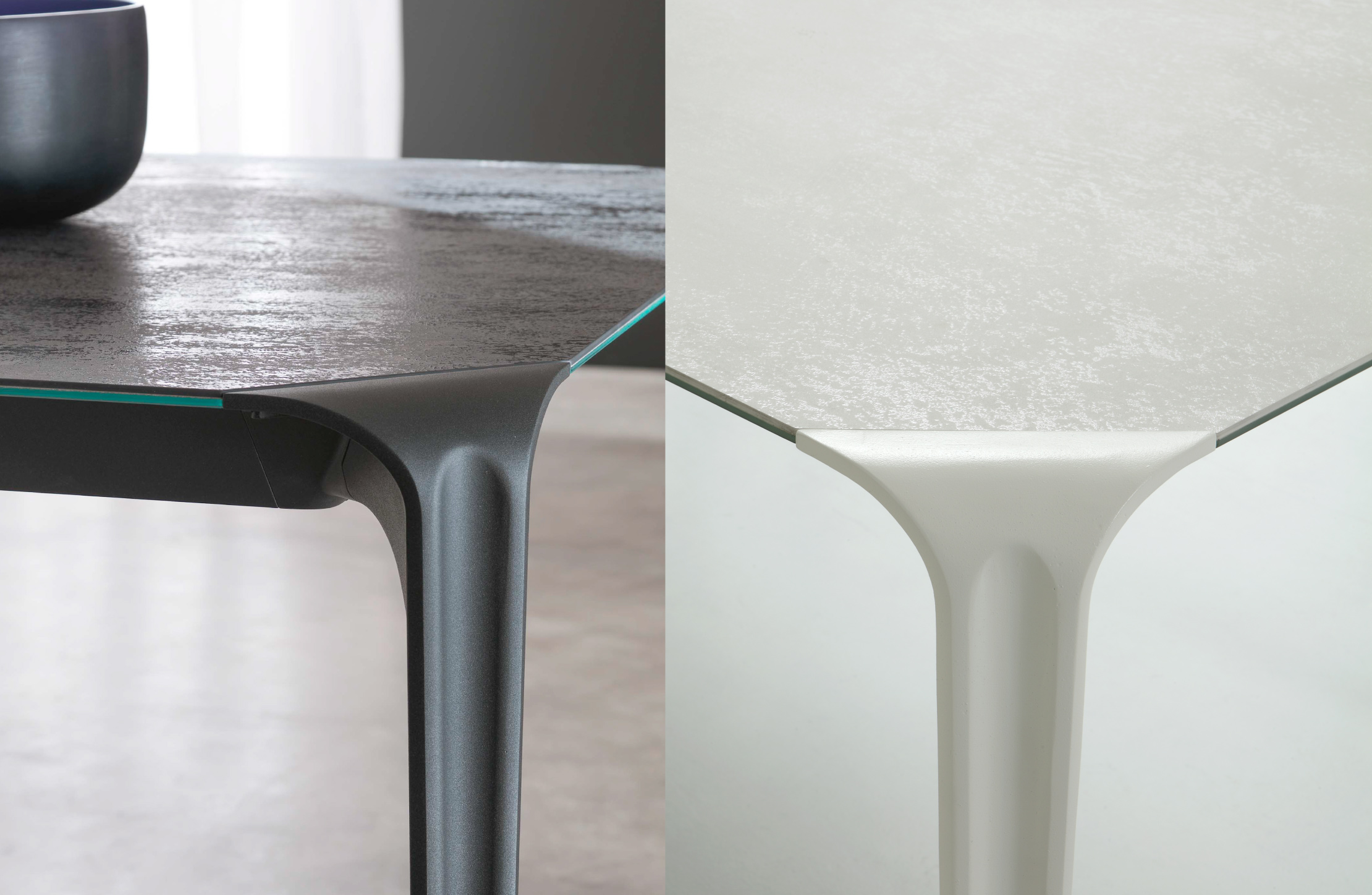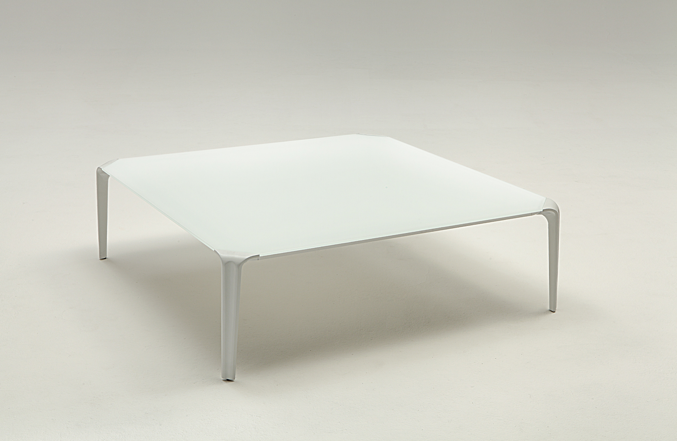 Serie di tavolini con struttura in alluminio estruso, gambe e giunti in alluminio pressofuso. Finitura brillante o verniciata con polveri epossidiche. Piani in cristallo verniciato o ceramica stratificata con vetro. Disponibile anche nella versione per uso esterno.